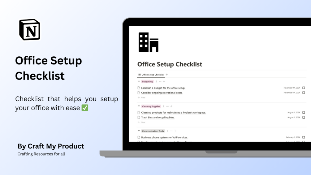 - Checklist to keep track of office setup requirements along with task deadlines and status of each task
